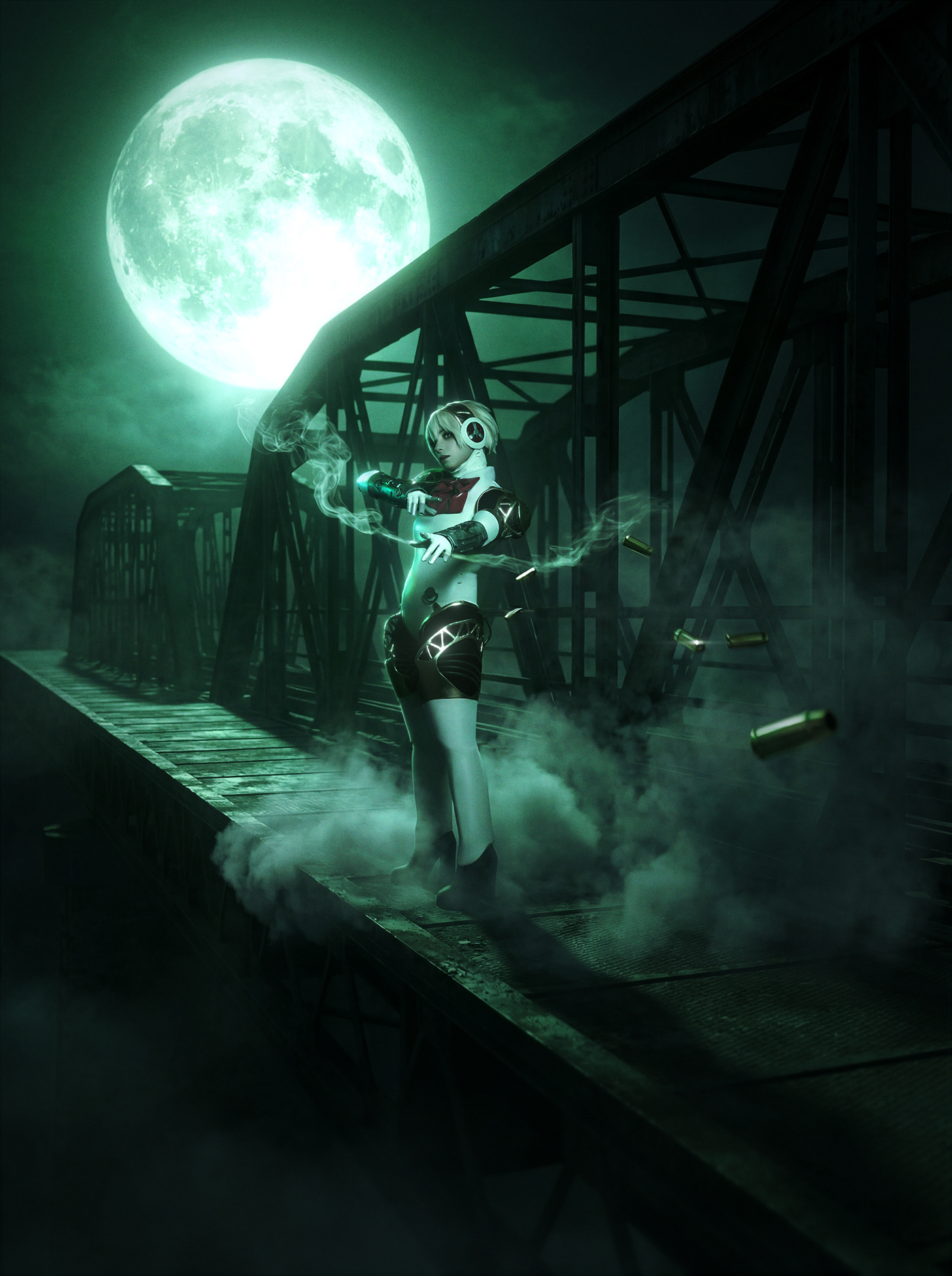 Custom ComfyUI workflow using Flux 2 generating separate assets like the bridge, moon and bullet shells. Final background blending using a custom system instruction with Nano Banana Pro. Subject blending, effects, grading and retouch in Photoshop.